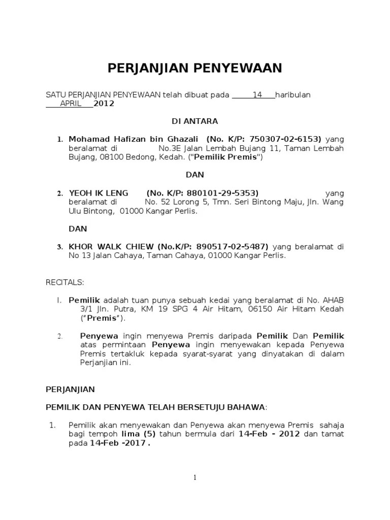 Perjanjian sewa kedai adalah suatu kontrak yang dilakukan antara pemilik premis dan penyewa yang merangkumi peraturan, syarat, atau tanggugungjawab bersama yang . Membayar sewa pendahuluan pada hari seperti mana ditetapkan. Syarat dan perjanjian sewa adalah seperti berikut: Tuan, saya nk tanya kalau premis perniagaan yg kita bagi sewa tiada surat perjanjian dan saya nak tamatkan sewaan kedai sebab dah tak nak buat . Surat perjanjian sewa rumah (premis kedai no.1) dan saya sazlinda binti saidin.